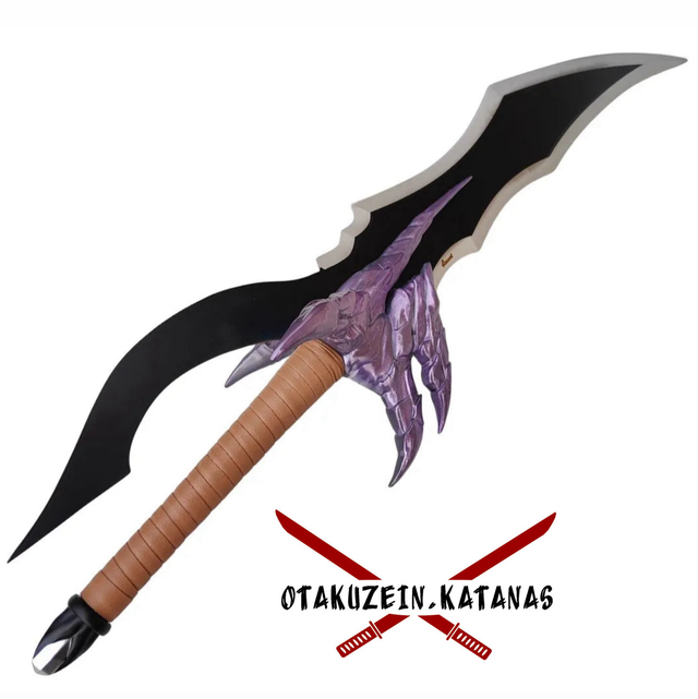 Daga S3334 Modelo de daga «Colmillo de Rasaka» de Solo Leveling, réplica No oficial, con un tamaño total de 60 cm, hoja de acero acabdo en negro con el corte satinado, guarda de color morado y el mango terminado en encordado marrón. Con soporte. Ref. S3334
