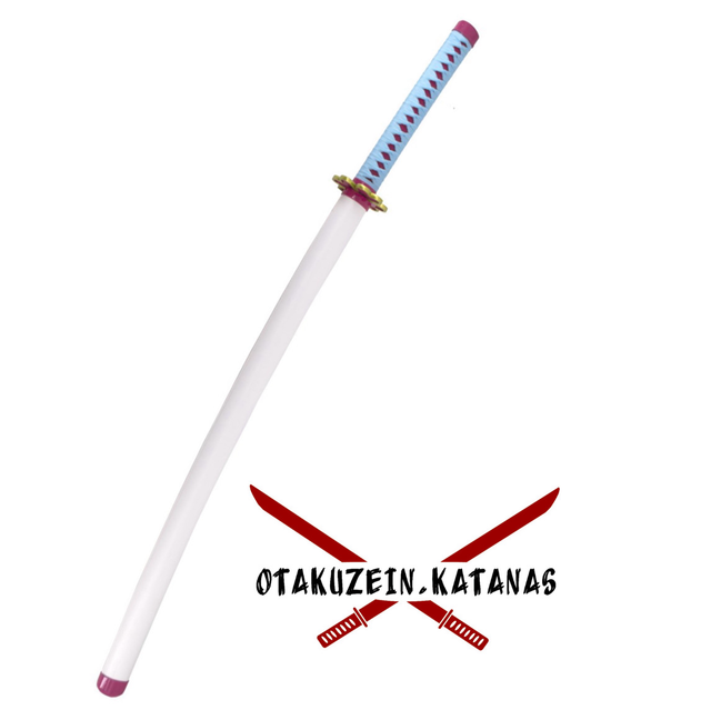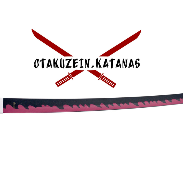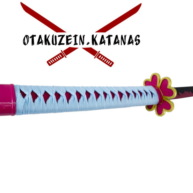 Katana S0252 de Demon Slayer empuñada por Kanroji Mitsuri réplica no oficial de 101 cm hoja de acero acabada en negro con detalles rosas, mango con encordado azul cielo con piel de imitación de raya color rosa con funda blanca. Ref. S0252