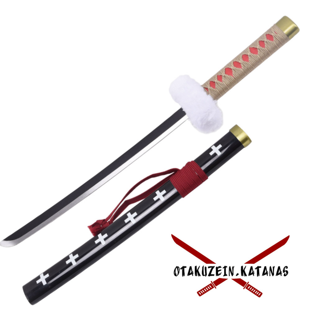 Katana S5055 de Trafalgar Law de One Piece réplica no oficial de 45 cm hoja de acero negra con corte en satinado, mango con encordado morado y Tsuba forrada con terciopelo, con soporte. Ref. S5055