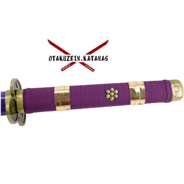 Katana S5074 Katana Enma de Zoro de One Piece réplica no oficial acabada en lila, de 104 cm hoja de acero acabada en negro con detalles en el corte lilas, con vaina lila con detalles dorados y encordado rojo, mango con encordado lila con con detalles dorados, con soporte. Ref. S5074